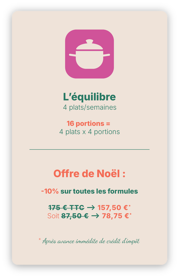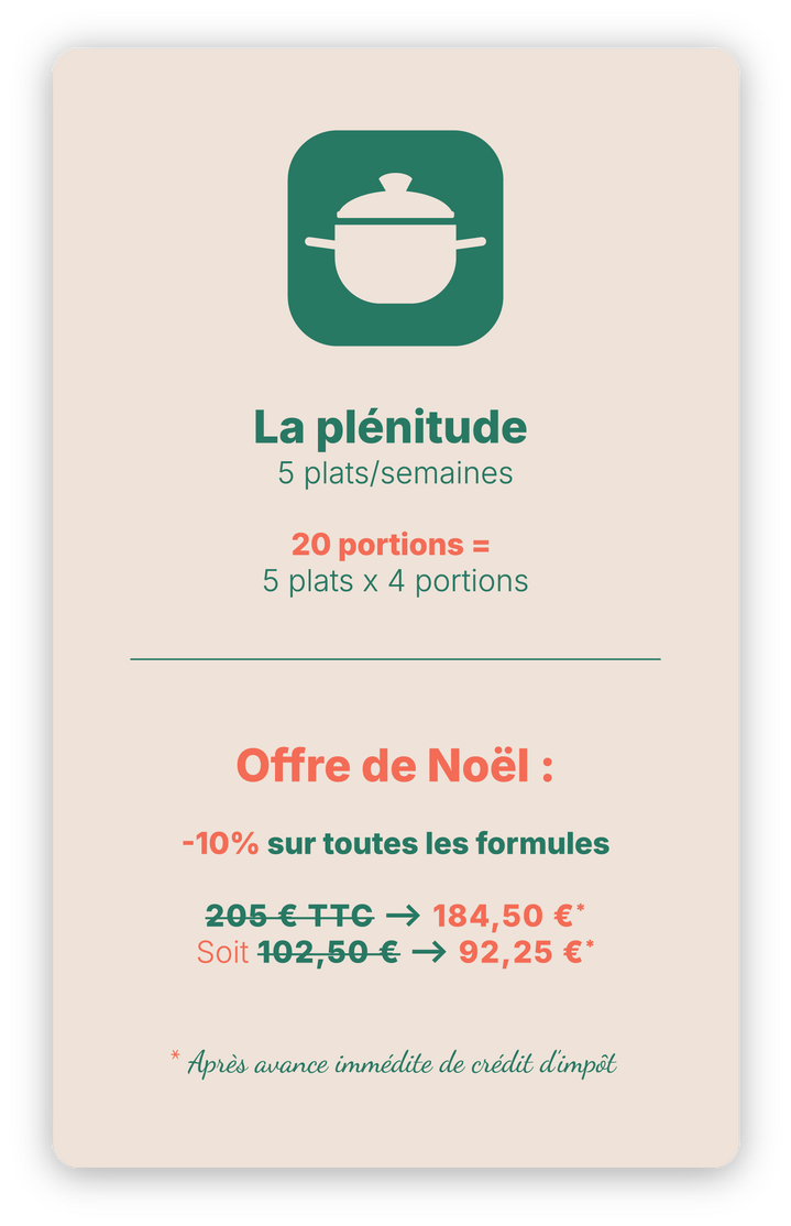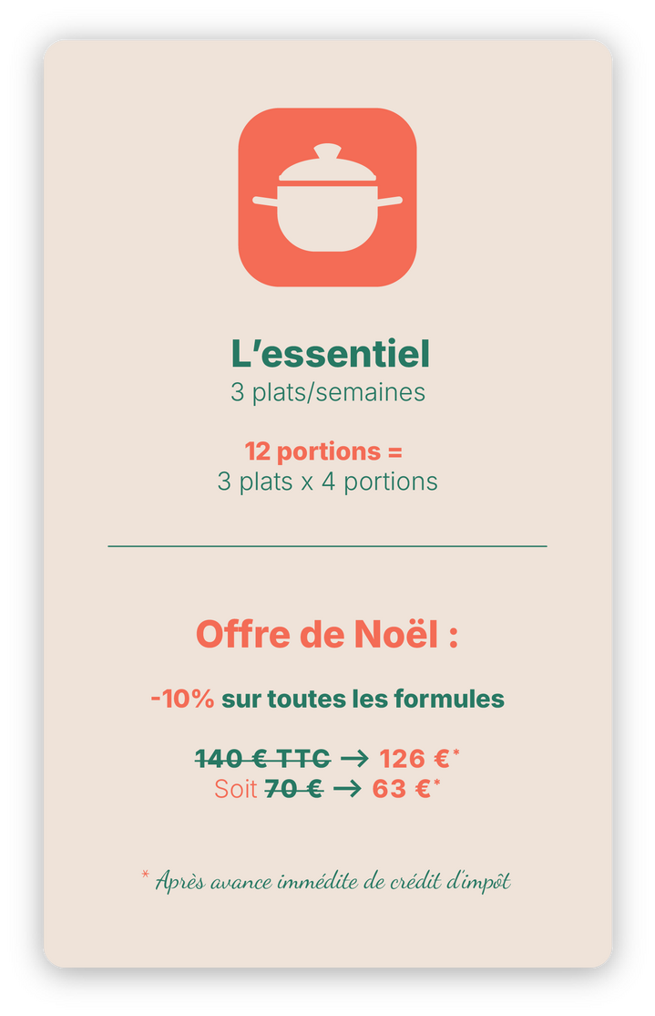 Vos repas maison préparés à l’avance vous simplifient la vie, et grâce au crédit d’impôt immédiat de 50 %, votre plaisir coûte deux fois moins cher.