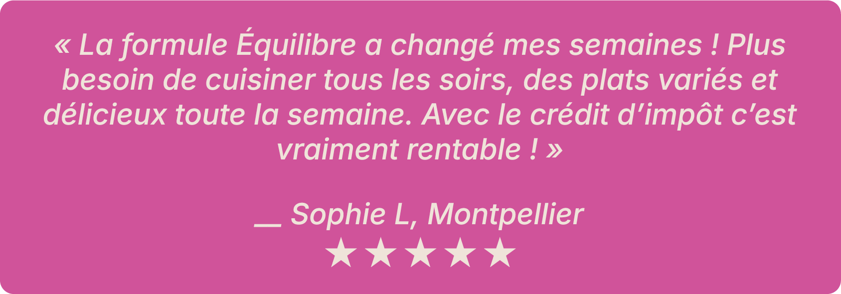 Vos repas maison préparés à l’avance vous simplifient la vie, et grâce au crédit d’impôt immédiat de 50 %, votre plaisir coûte deux fois moins cher.
